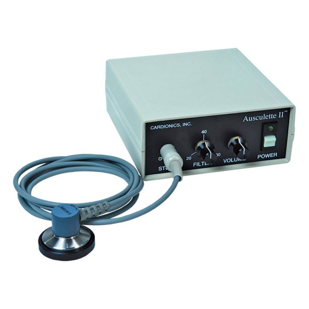 The Ausculette II is a small, battery or line-operated telemedicine auscultation system used primarily in telemedicine. It consists of 2 stethophones, a stethoscope assembly and wall-mounted power transformer.
