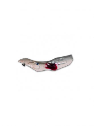 The new, more advanced arm has a double lumen 5FR-PICC (Peripherally Inserted Central Catheter), which comes out of the V. basilica – the preferred access. In the area of the PICC catheter there is a cavity for inserting a peripheral port (this port is pictured but is not included with the delivery). A further feature of the new arm is a 20G IV catheter in the lower arm. The new, more advanced arm has greater rotation and extension than the previous model and can be used for practising cleaning, applying bandages and fixings, as well as inserting and removing IVs.