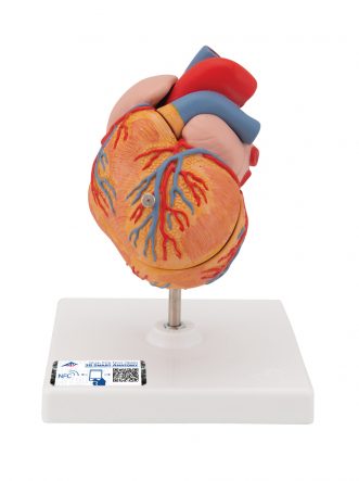 This unique heart model shows the long-term effects of increased heart activity due to high blood pressure. The muscular wall of the left heart ventricle is considerably thickened and the tip of the heart is visibly rounded off. Highly detailed 2-part heart at a price you will love. The front heart wall is detachable to reveal the chambers and valves inside. The heart is just slightly smaller than life-size with exquisite anatomical detail throughout. Heart on removable stand.
