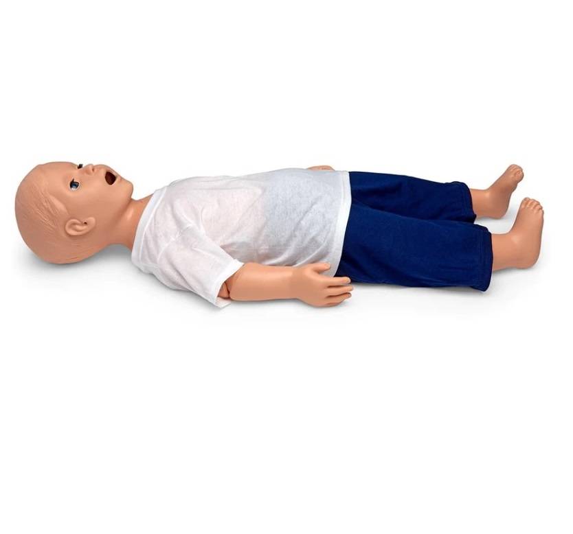 Features soft, childlike face skin self-molded hair eyes open and close in realistic eye sockets for ophthalmic procedures fully articulated head and jaw with teeth and tongue NG and otic exercises bends 30° at waist jointed elbows and knees realistic hands, feet, fingers, and toes soft upper body skin over hard upper body intramuscular injection sites in left and right upper thighs TB test site interchangeable male organ tracheostomy opening male and female catheterization removable internal tanks enema administration and neck brace