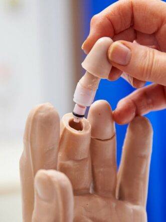 - Natural size, realistic adult left hand. Middle and ring finger with removable blood pads for blood glucose sampling