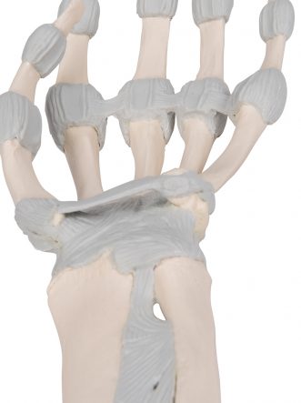 This single-part hand skeleton model shows the anatomy of the ligaments in the hand in detail. It is ideally suited both as a teaching aid as well as for anatomy classes, such as for medical students, physiotherapists and occupational therapists. The carpals (ossa carpi), the metacarpals (ossa metacarpi) and finger bones (ossa digitorum manus) are shown as osseous structures. In the distal area of the forearm, the radius and the ulna are represented.