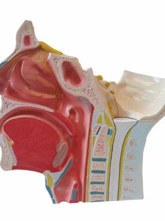 Model showing the dissection of half a human head 2 1/2 times life size. Shows the 12 cranial nerves with collateral branches and autonomic nerves. The median section reveals the upper respiratory tract and pharynx. The eyeball is removable for closer examination. Important anatomical structures are numbered and indicated in different colors for easy understanding. Made with long-lasting synthetic material. Mounted on durable polymer base with stand