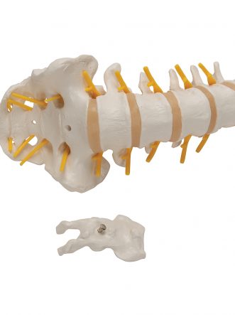 The human lumbar spinal column Consists of the 5 lumbar vertebrae with intervertebral discs, sacrum with flap, coccyx, spinal nerves and dura mater of spinal cord. This high quality spinal replica has accurate anatomical detail for use in any anatomy classroom. The lumbar spinal column is delivered on a removable high quality stand.
